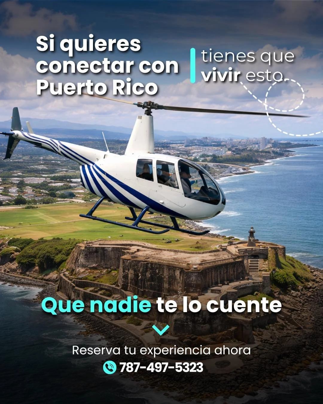 If you want a unique, festive and VIP experience we can offer you our βTasting Puerto Rico Tourβ. On this tour we will fly over the areas of San Juan, then we will take you to 1 of 6 restaurants or attractions to select, with up to 2 hours waiting on land with no extra cost. This offers a truly local experience in which we will reserve the table or amenities and prepare everything for your arrival. Here is a list of the restaurants or attractions: